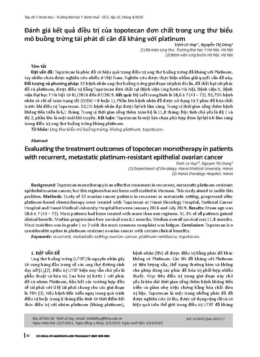 Đánh giá kết quả điều trị của topotecan đơn chất trong ung thư biểu mô buồng trứng tái phát di căn đã kháng với platinum