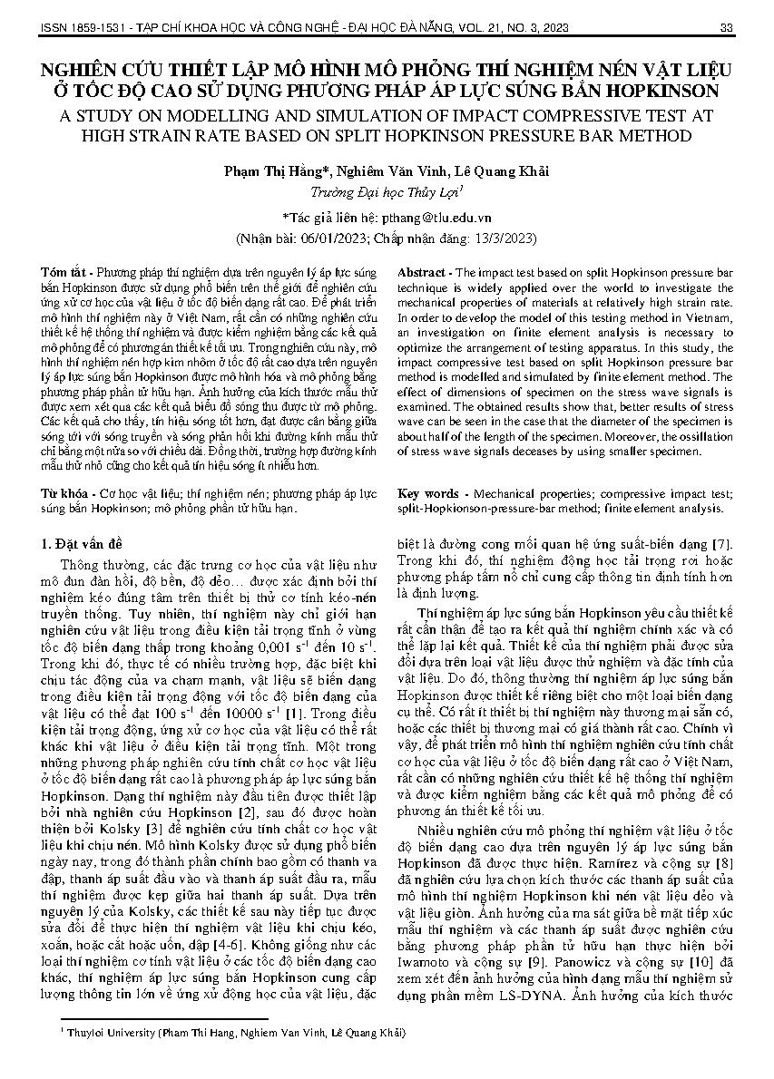 Nghiên cứu thiết lập mô hình mô phỏng thí nghiệm nén vật liệu ở tốc độ cao sử dụng phương pháp áp lực súng bắn hopkinson = A study on modelling and simulation of impact compressive test at high strain rate based on split hopkinson pressure bar method