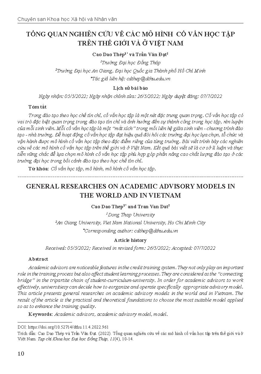 Tổng quan nghiên cứu về các mô hình cố vấn học tập trên thế giới và ở Việt Nam = General researches on academic advisory models in the world and in Vietnam