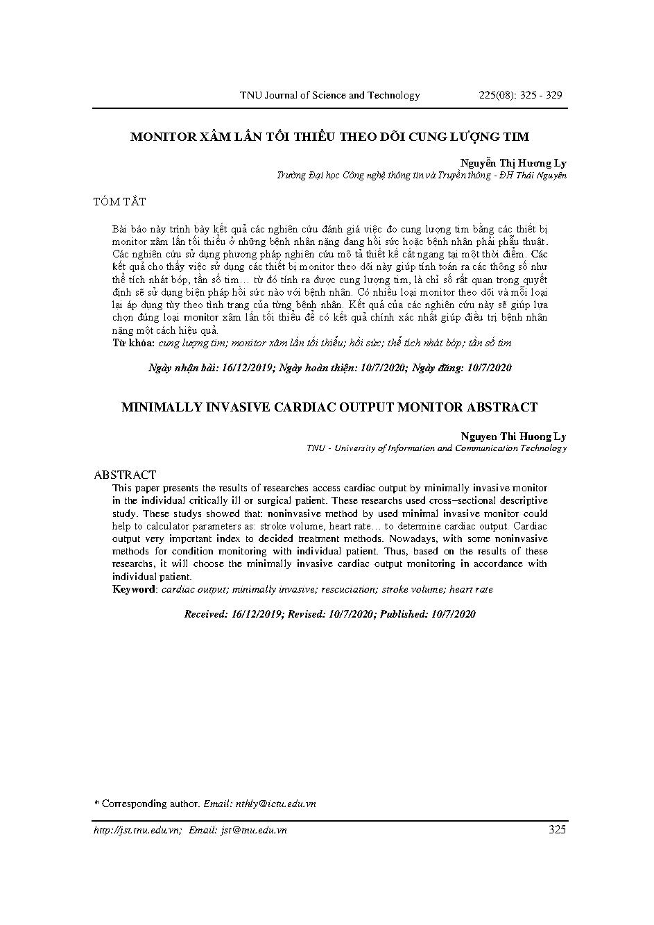 MINIMALLY INVASIVE CARDIAC OUTPUT MONITOR ABSTRACT = MONITOR XÂM LẤN TỐI THIỂU THEO DÕI CUNG LƯỢNG TIM