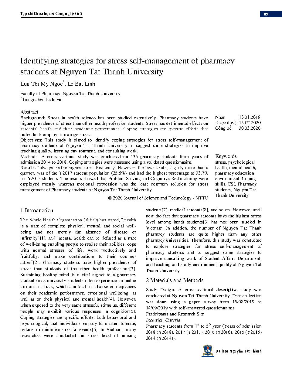Khảo sát các biện pháp tự quản lí stress của sinh viên Khoa Dược Đại học Nguyễn Tất Thành = Identifying strategies for stress self-management of pharmacy students at Nguyen Tat Thanh University