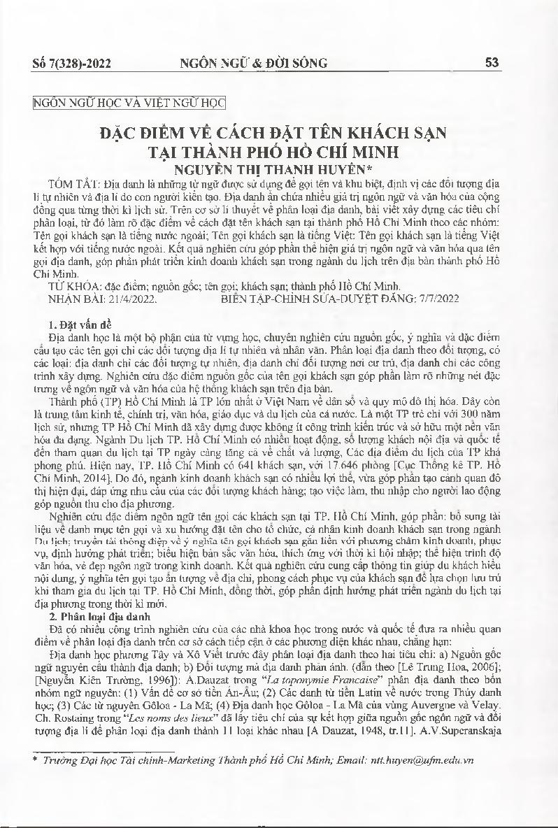 Đặc điểm về cách đặt tên khách sạn tại thành phố Hồ Chí Minh = Characteristics of how to name hotel in Ho Chi Minh City