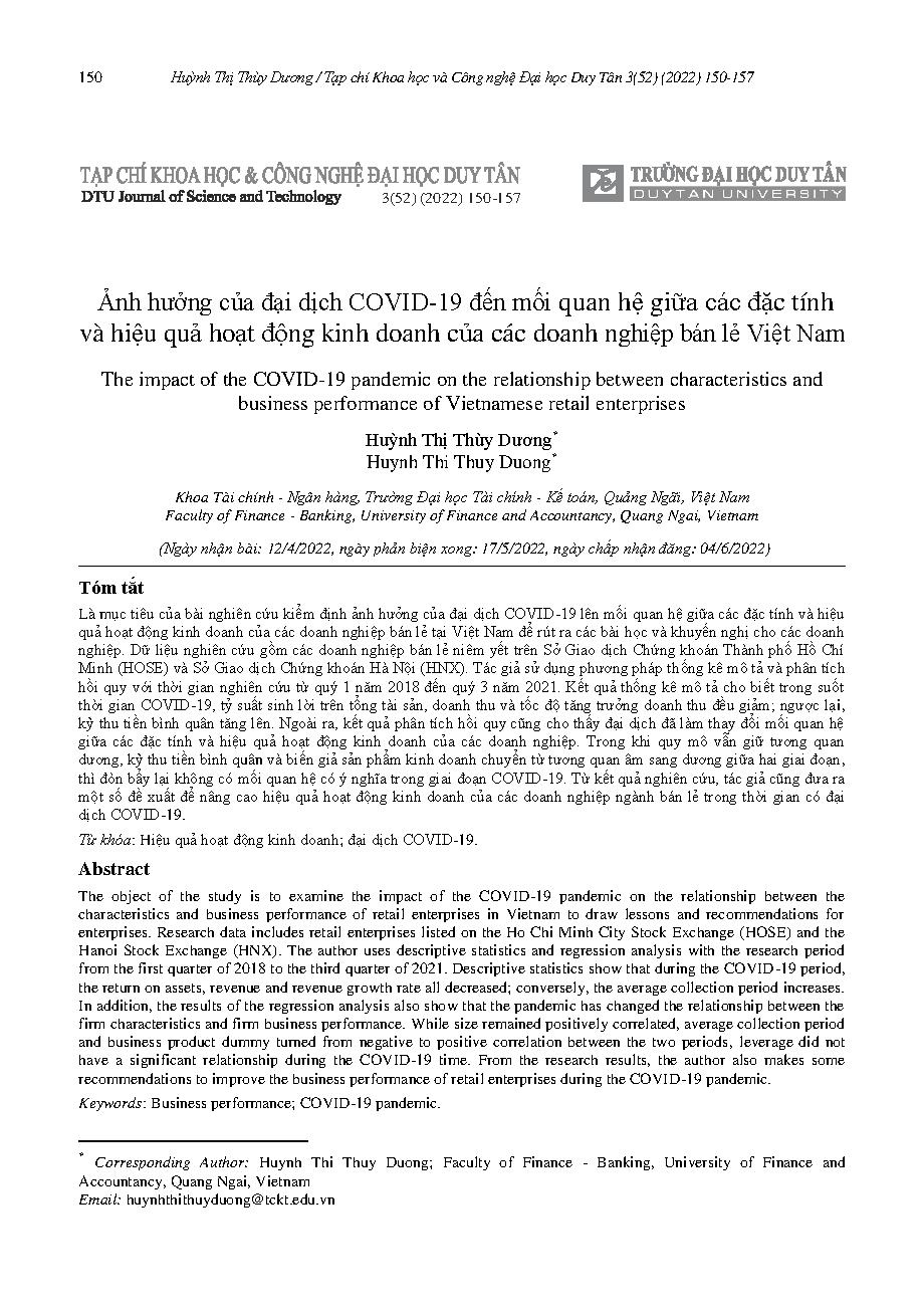 Ảnh hưởng của đại dịch COVID-19 đến mối quan hệ giữa các đặc tính và hiệu quả hoạt động kinh doanh của các doanh nghiệp bán lẻ Việt Nam = The impact of the COVID-19 pandemic on the relationship between characteristics and business performance of Vietnames