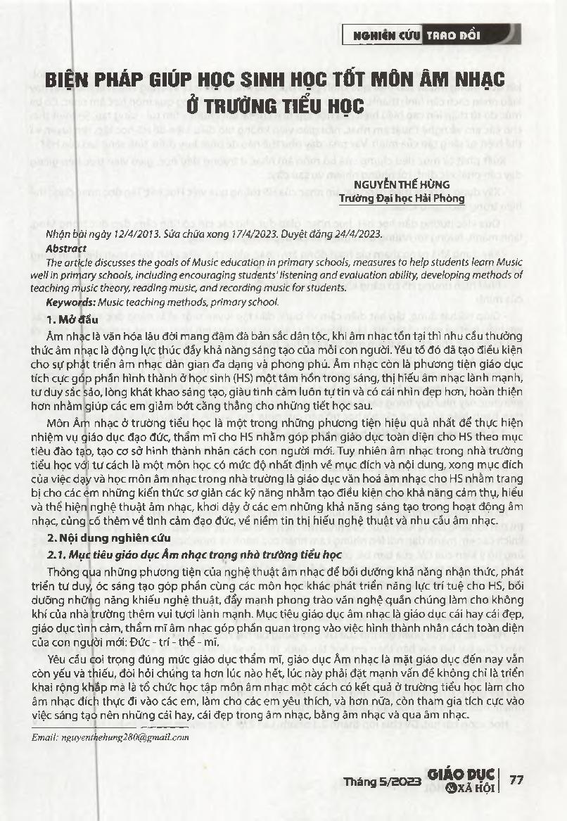 Biện pháp giúp học sinh học tốt môn Âm nhạc ở trường tiểu học = Measures to help students learn Music well in primary school.