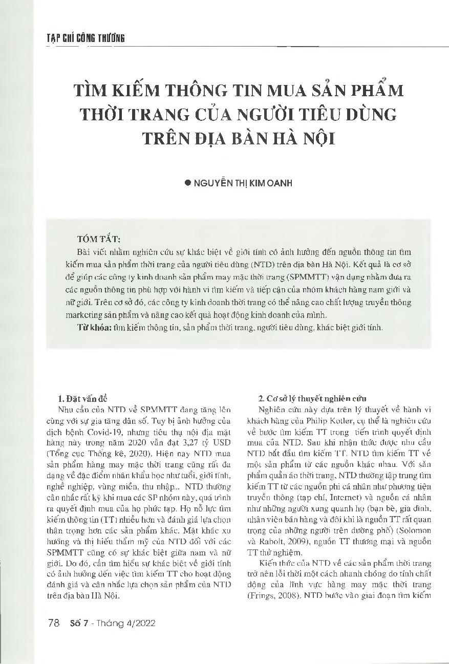 Tìm kiếm thông tin mua sản phẩm thời trang của người tiêu dùng trên địa bàn Hà Nội = The information search of consumers in Hanoi to purchase fashion products