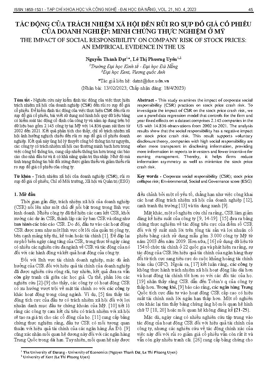 Tác động của trách nhiệm xã hội đến rủi ro sụp đổ giá cổ phiếu của doanh nghiệp: minh chứng thực nghiệm ở Mỹ = The impact of social responsibility on company risk of stock prices: an empirical evidence in the US