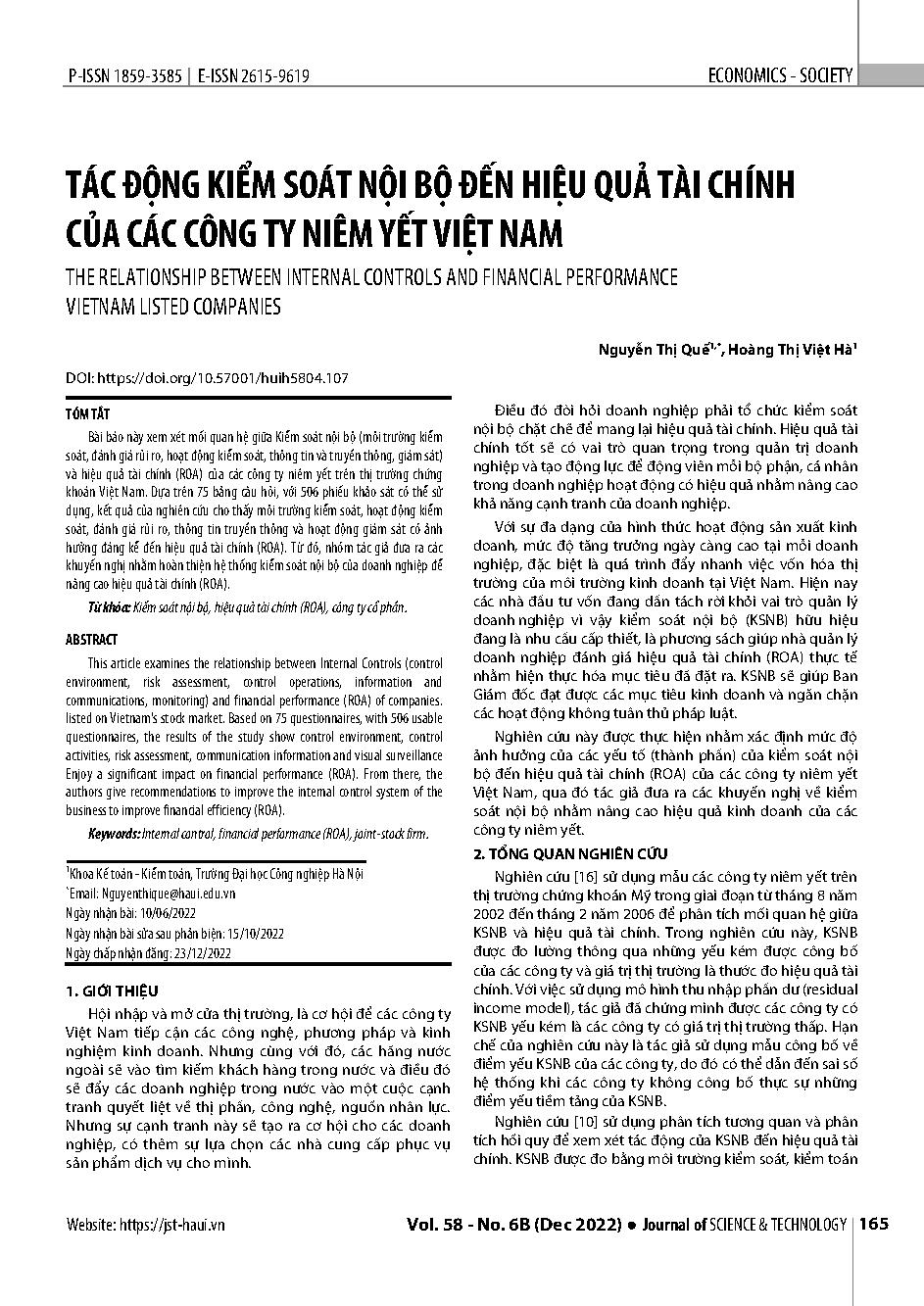 Tác động kiểm soát nội bộ đến hiệu quả tài chính của các công ty niêm yết Việt Nam = The relationship between Internal Controls and financial performance Vietnam listed compan