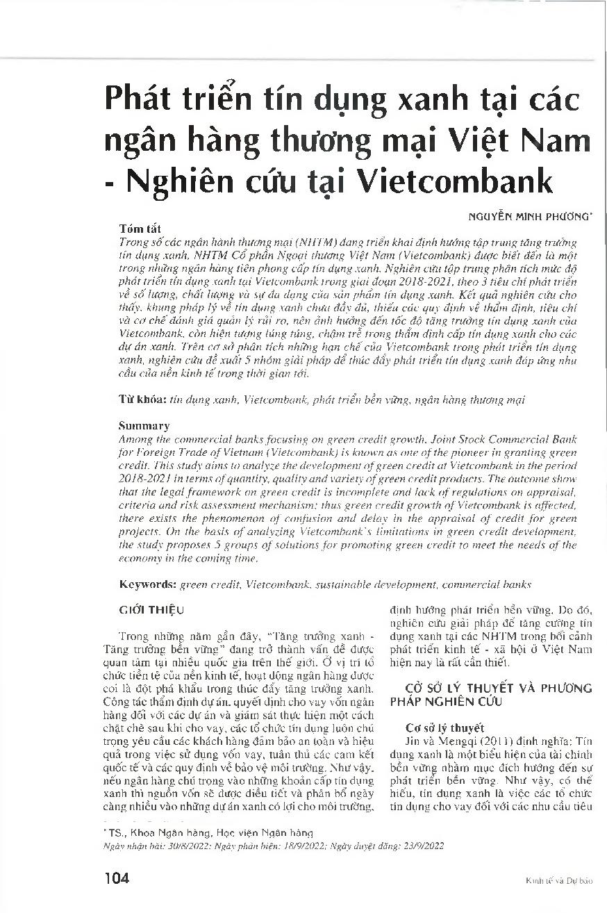 Phát triển tín dụng xanh tại các ngân hàng thương mại Việt Nam - Nghiên cứu tại Vietcombank = Boosting green credit in Vietnamese commercial banks - The case of Vietcombank