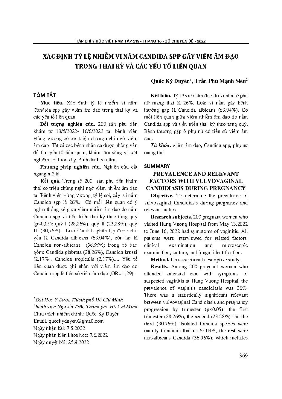 Xác định tỷ lệ nhiễm vi nấm Candida spp gây viêm âm đạo trong thai kỳ và các yếu tố liên quan = Prevalence and relevant factors with vulvovaginal candidiasis during pregnancy