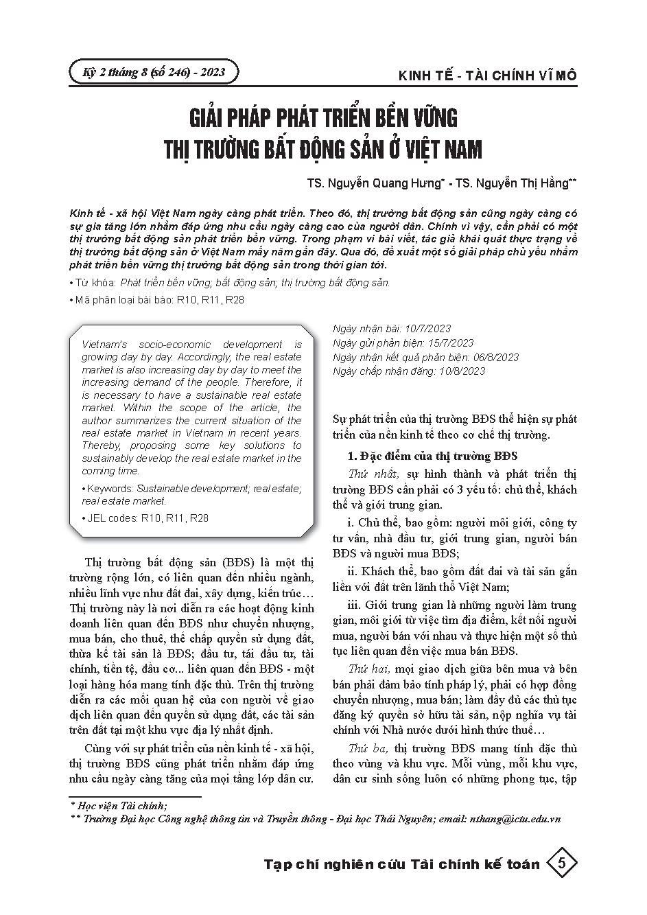 Giải pháp phát triển bền vững thị trường bất động sản ở Việt Nam = Sustainable development solutions for the real estate market in Vietnam