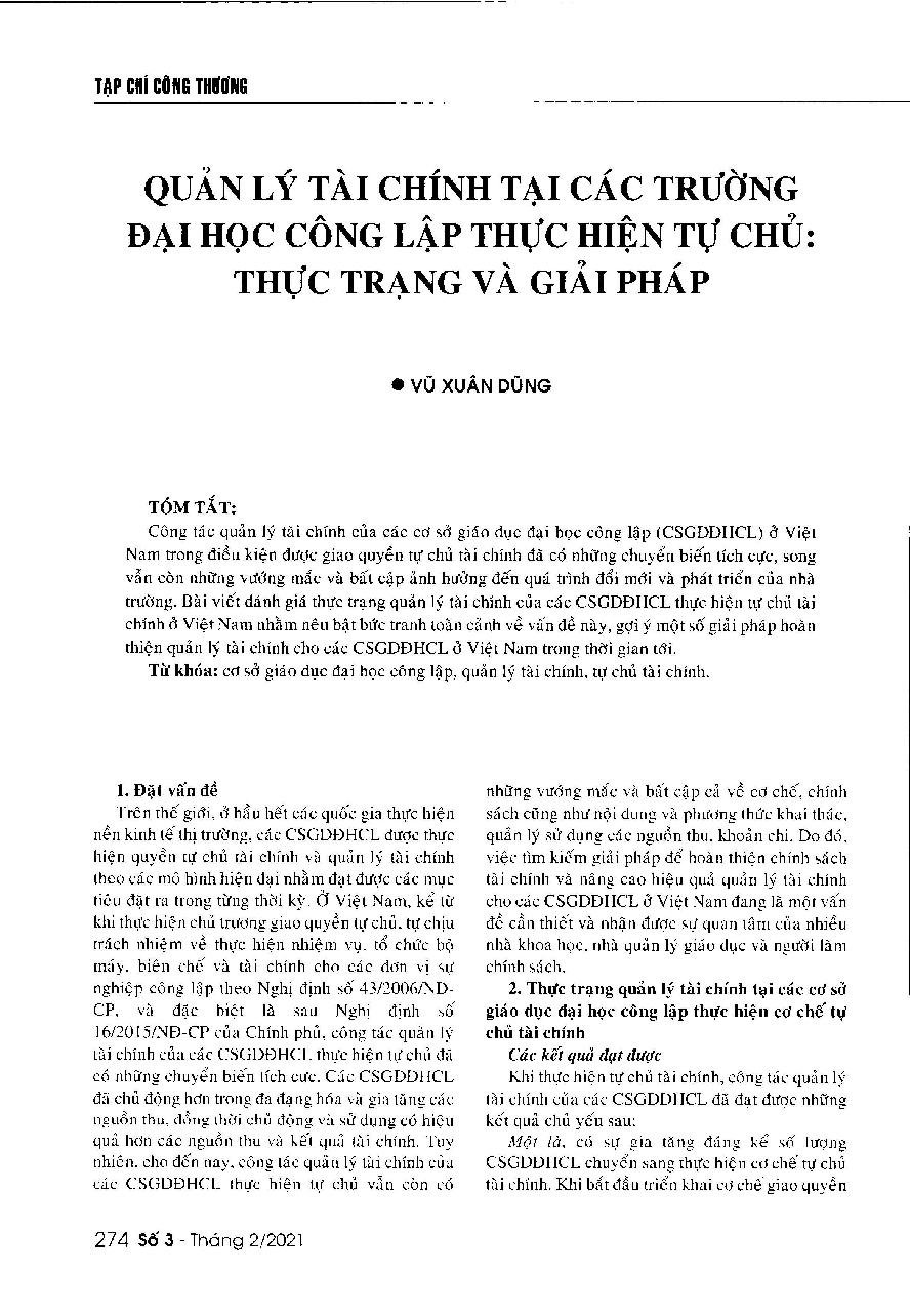 Quản lý tài chính tại các trường đại học công lập thực hiện tự chủ: Thực trạng và giải pháp = Financial management at Vietnamese public higher education institutions when implementing financial self-autonomy: Current situation and solutions