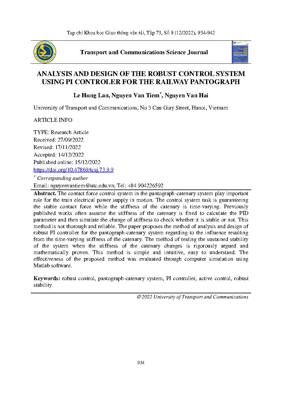 Phân tích và tổng hợp hệ thống điều khiển bền vững sử dụng bộ điều khiển pi cho cần tiếp điện của tàu điện = Analysis and design of the robust control system using pi controler for the railway pantograph