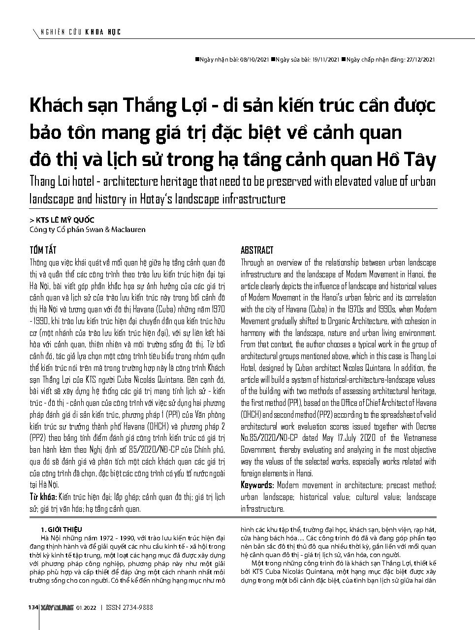 Khách sạn Thắng Lợi - di sản kiến trúc cần được bảo tồn mang giá trị đặc biệt về cảnh quan đô thị và lịch sử trong hạ tầng cảnh quan Hồ Tây = Thang Loi hotel - architecture heritage that need to be preserved with elevated value of urban landscape and hist