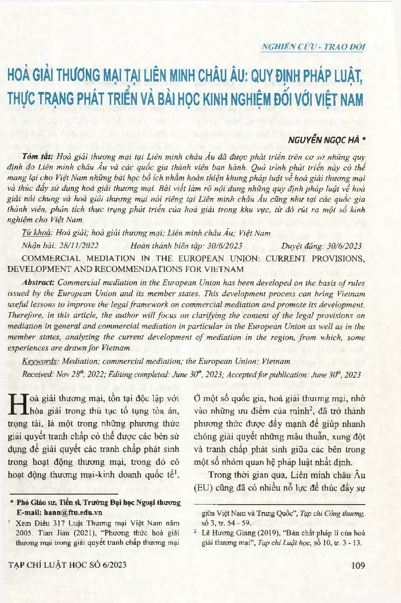 Hoà giải thương mại tại Liên minh châu Âu: quy định pháp luật, thực trạng phát triển và bài học kinh nghiệm đối với Việt Nam = Commercial mediation in the European Union: current provisions, development and recommendations for Vietnam