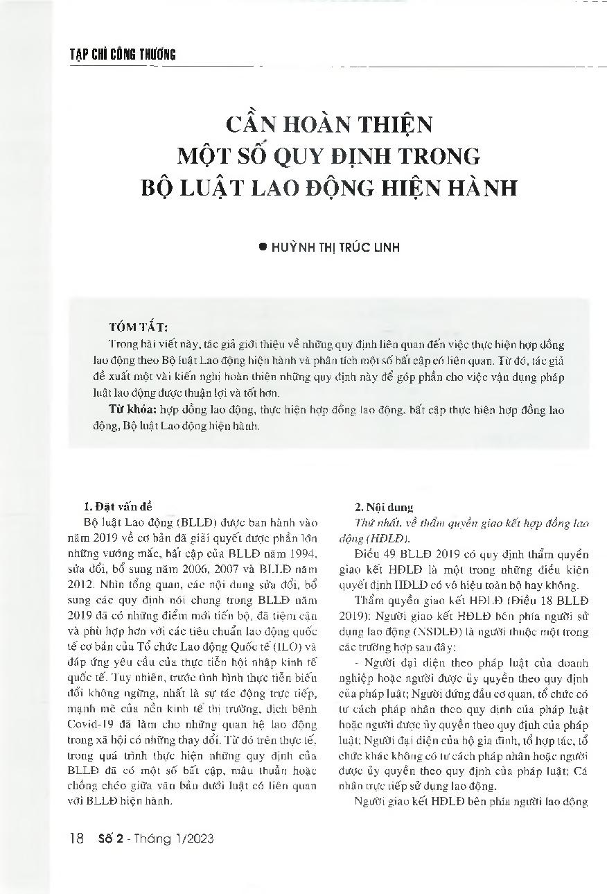 Cần hoàn thiện một số quy định trong Bộ luật Lao động hiện hành = The need for improving some provisions of the performance of labor contracts under the current Labor Code