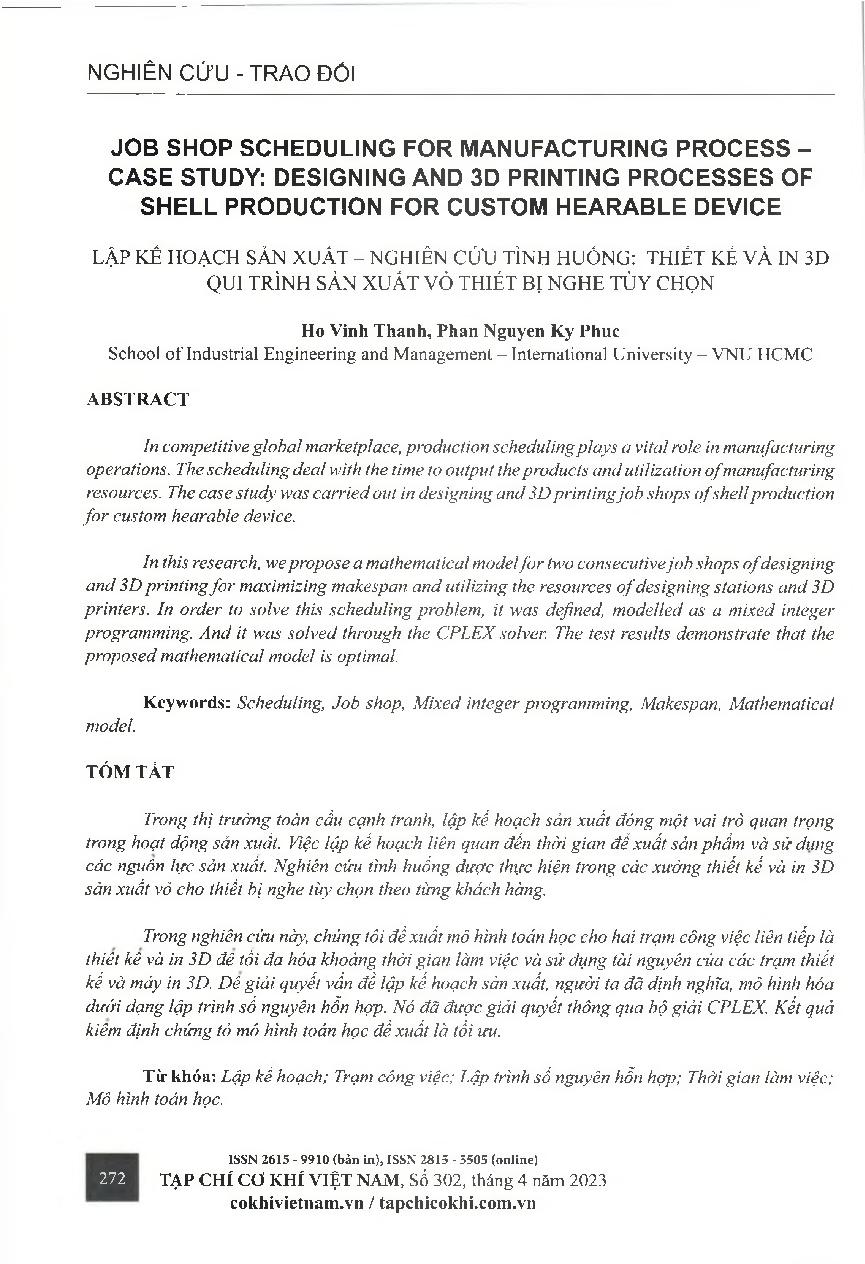 Lập kế hoạch sản xuất - nghiên cứu tình huống: thiết kế và in 3D qui trình sản xuất vỏ thiết bị nghe tùy chọn = Job shop scheduling for manufacturing process - case study: designing and 3D printing processes of shell production for custom hearable device