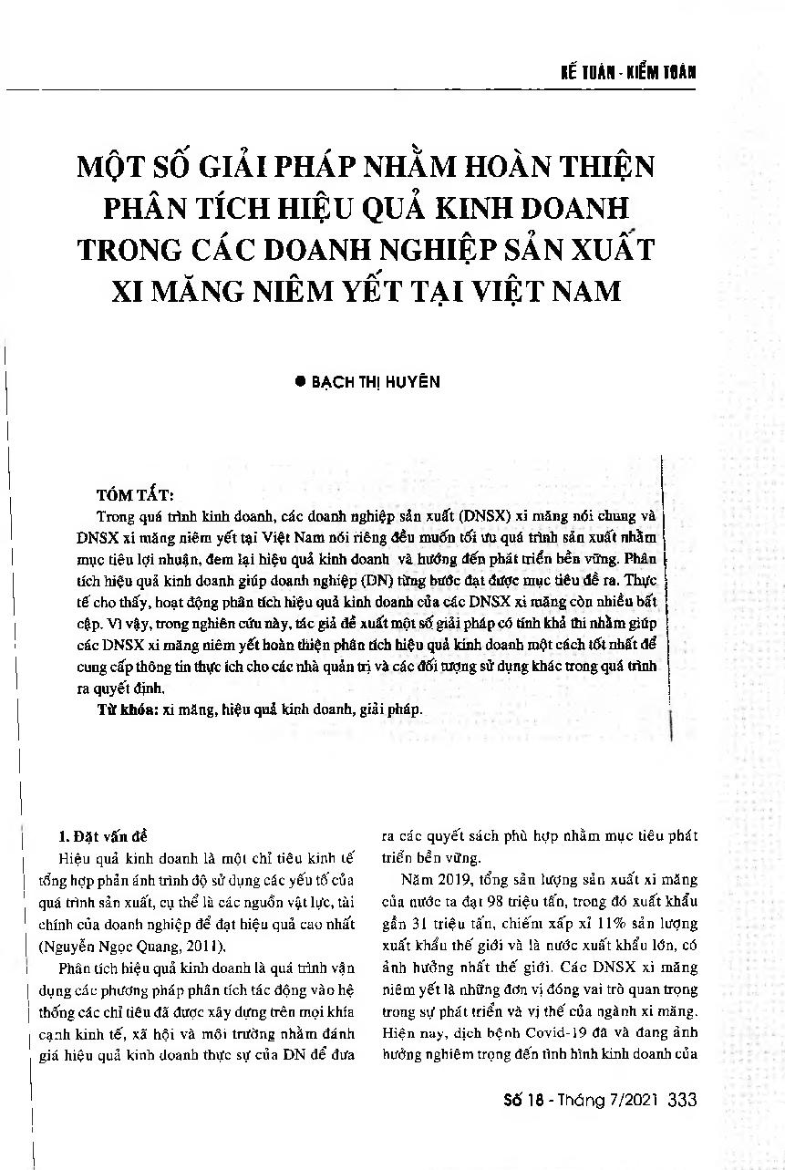 Một số giải pháp nhằm hoàn thiện phân tích hiệu quả kinh doanh trong các doanh nghiệp sản xuất xi măng niêm yết tại Việt Nam = Some solutions to improve the effectiveness of business performance analysis at listed cement manufacturing enterprises in Vietnam