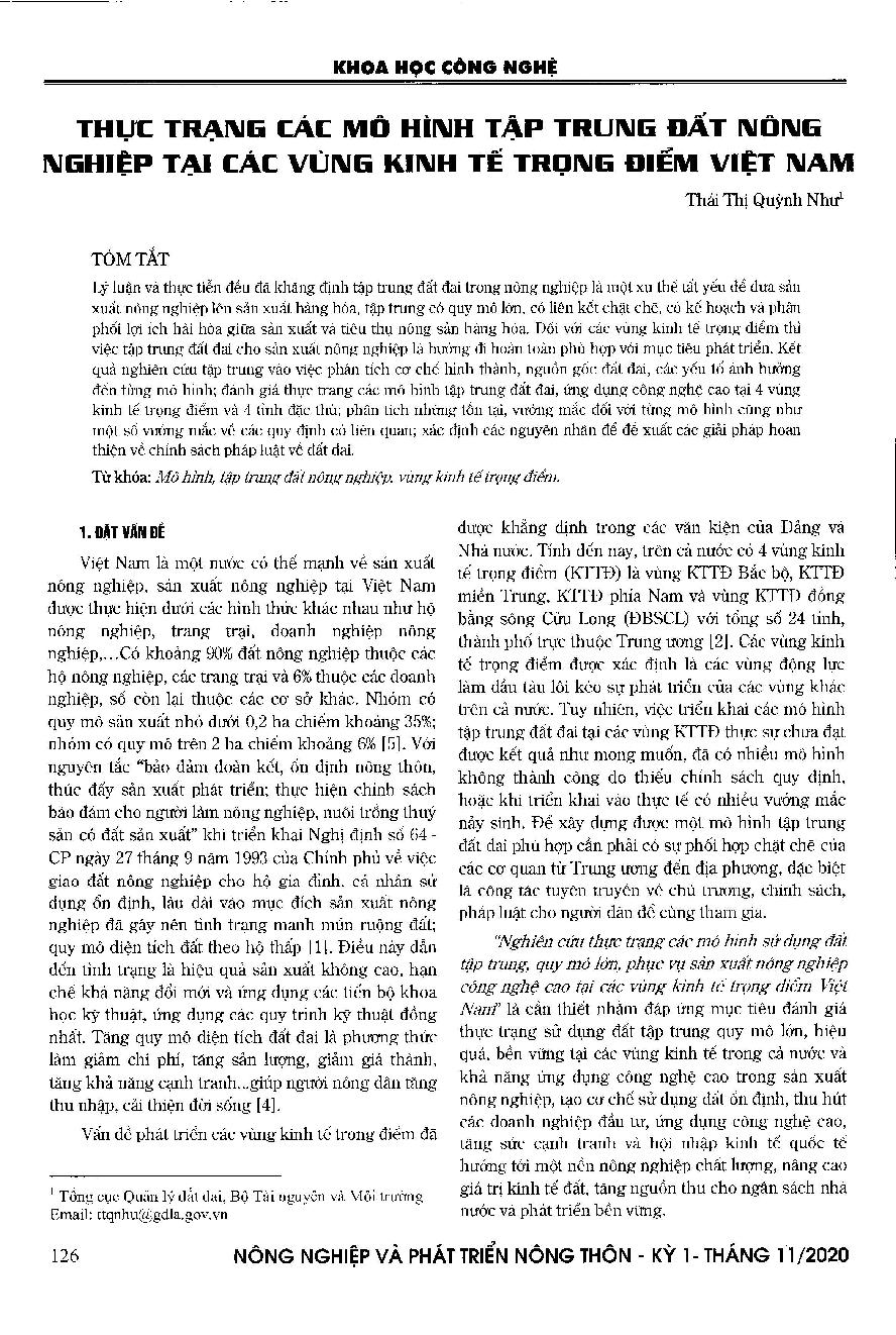 Thực trạng các mô hình tập trung đất nông nghiệp tại các vùng kinh tế trọng điểm Việt Nam = Situation of agricultural land concentration models in the key economic regions of Vietnam