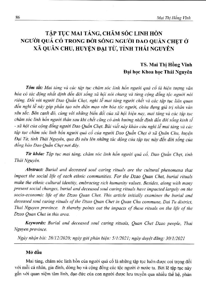 Tập tục mai táng, chăm sóc linh hồn người quá cố trong đời sống người Dao Quần Chẹt ở xã Quân Chu, huyện Đại Từ, tỉnh Thái Nguyên
