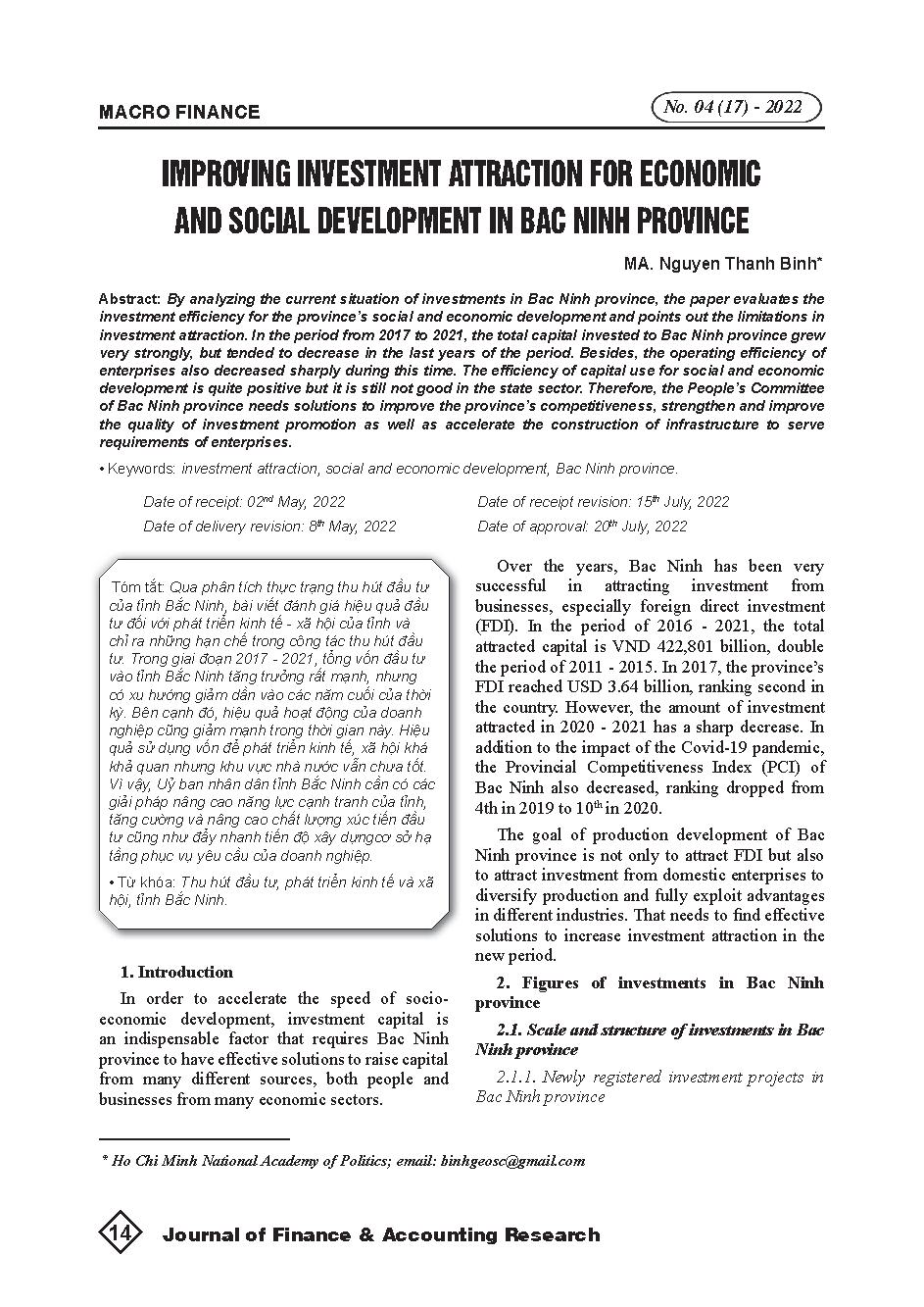 Nâng cao thu hút đầu tư phát triển kinh tế, xã hội tại tỉnh Bắc Ninh = Improving investment attraction for economic and social development in Bac Ninh province