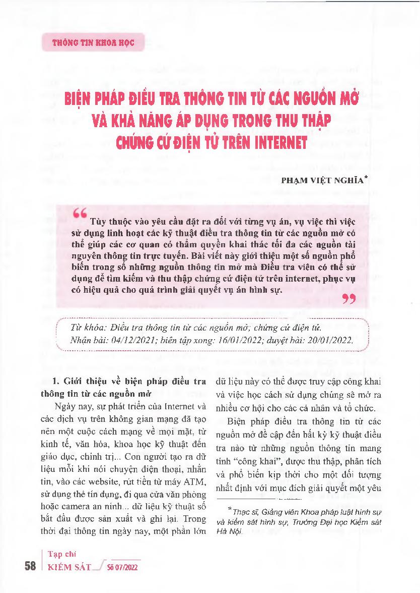 Biện pháp điều tra thông tin từ các nguồn mở và khả năng áp dụng trong thu thập chứng cứ điện tử trên Internet