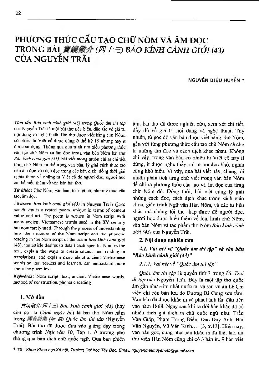 Phương thức cấu tạo chữ Nôm và âm đọc trong bài Bảo kính cảnh giới (43) của Nguyễn Trãi = Method of creating Nom scripts and phonetic reading in Nguyen Trai's Bao kinh canh gioi (43)