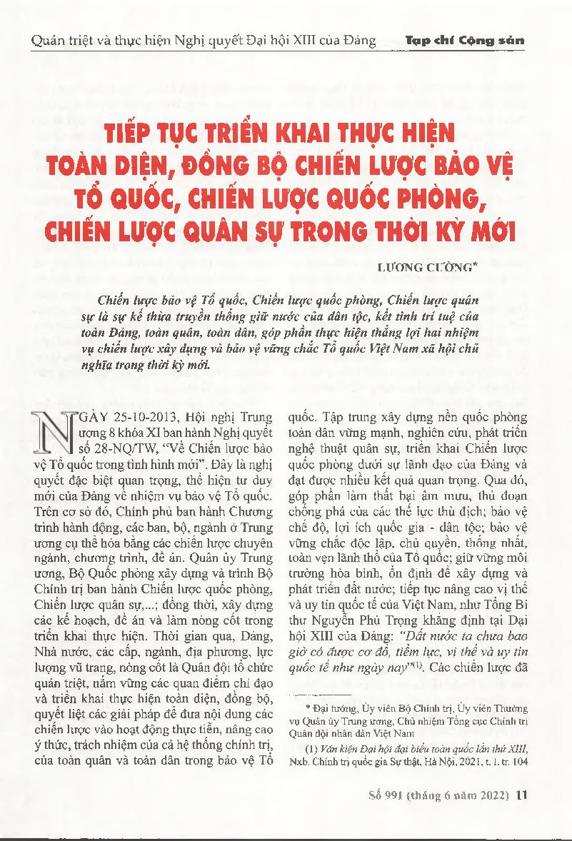 Tiếp tục triển khai thực hiện toàn diện, đồng bộ Chiến lược bảo vệ Tổ quốc, Chiến lược quốc phòng, Chiến lược quân sự trong thời kỳ mới = Continue to implement comprehensively and synchronously the National Defense Strategy, National Defense Strategy and