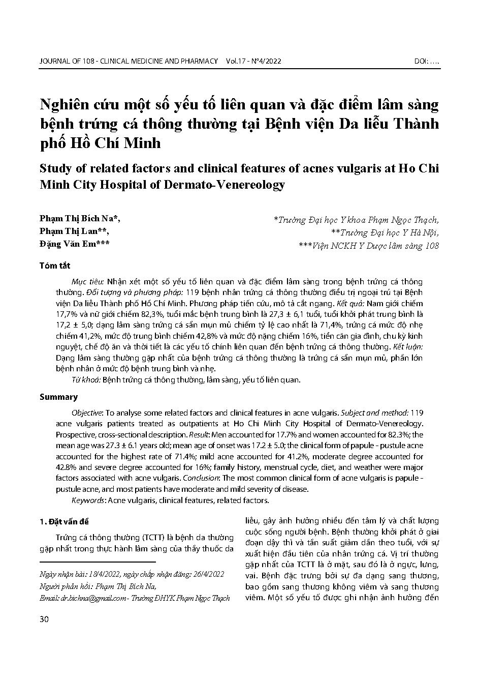 Nghiên cứu một số yếu tố liên quan và đặc điểm lâm sàng bệnh trứng cá thông thường tại Bệnh viện Da liễu Thành phố Hồ Chí Minh = Study of related factors and clinical features of acnes vulgaris at Ho Chi Minh City Hospital of Dermato-Venereology