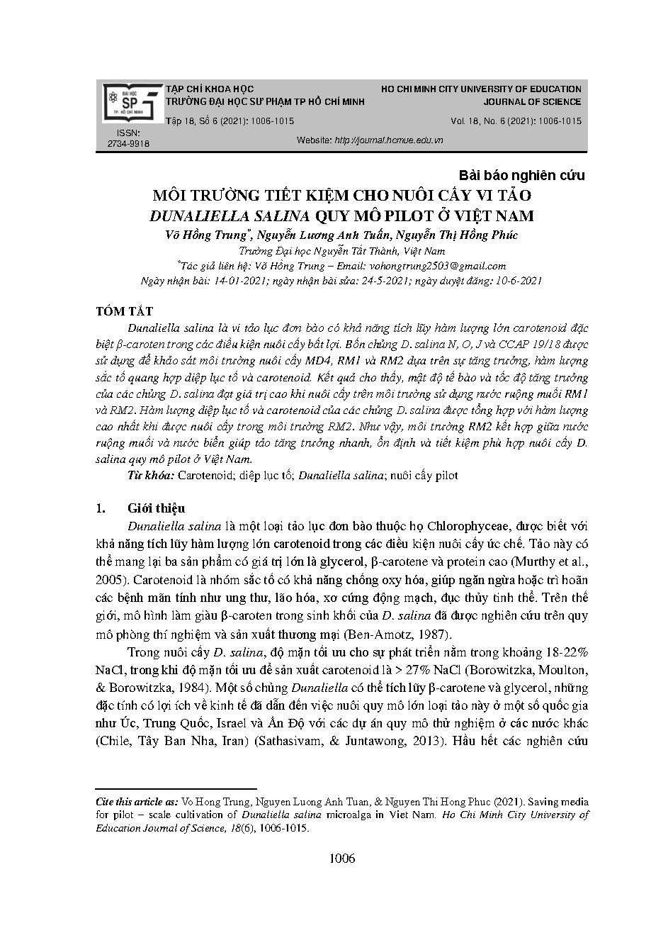 Môi trường tiết kiệm cho nuôi cấy vi tảo dunaliella salina quy mô pilot ở Việt Nam = Saving media for pilot – scale cultivation of dunaliella salina microalga in Viet Nam