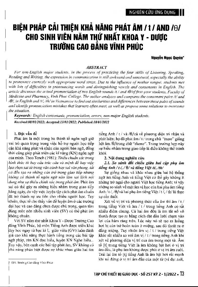 Biện pháp cải thiện khả năng phát âm /t/ and /Ø/ cho sinh viên năm thứ nhất khoa Y dược Trường Cao đẳng Vĩnh Phúc = Measures of enhancing the pronunciation /t/ and /o/for first-year students at Vinh Phuc College of Medicine and Pharmacy