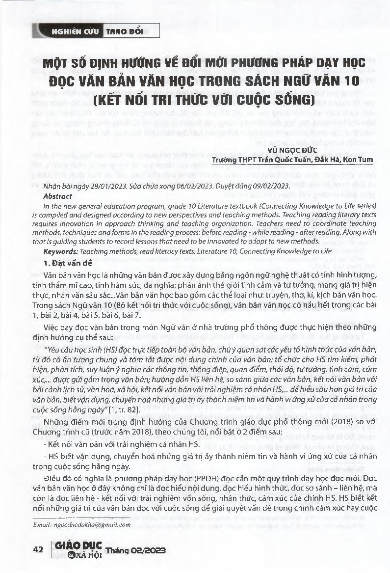 Một số định hướng về đổi mới phương pháp dạy học đọc văn bản văn học trong sách Ngữ văn 10 (Kết nối tri thức với cuộc sống) = Some orientations on innovation of teaching methods to read literacy texts in grade 10 Literature textbook (Connecting Knowledge