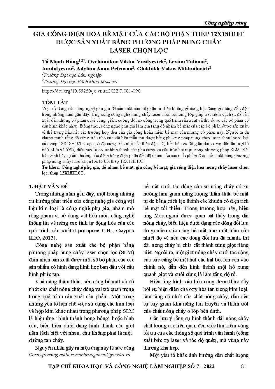 Gia công điện hóa bề mặt của các bộ phận thép 12x18h10t được sản xuất bằng phương pháp nung chảy laser chọn lọc = Electrical surface production of steel parts 12x18h10t produced with selection laser fusing methods