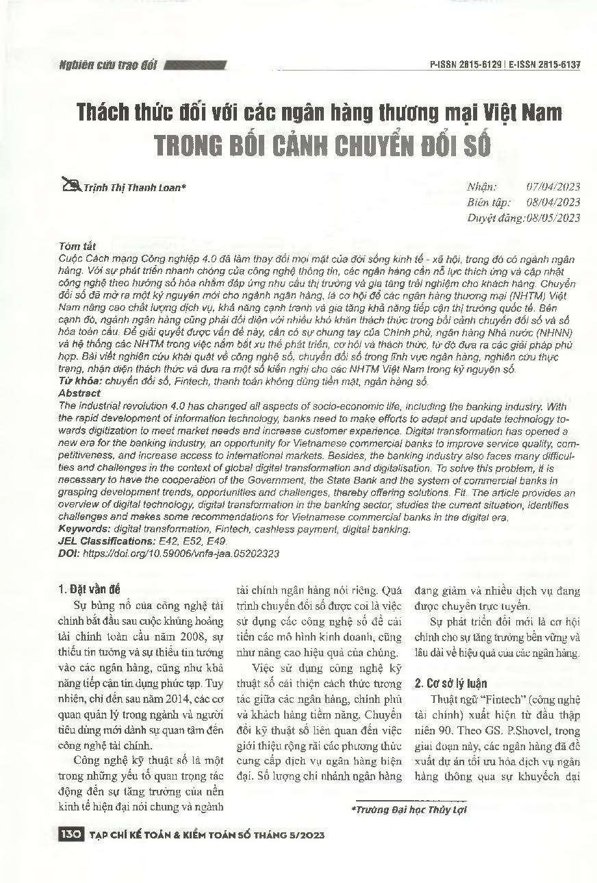 Thách thức đối với các ngân hàng thương mại Việt Nam trong bối cảnh chuyển đổi số = Challenges for Vietnam commercial banks in the context of digital transformation