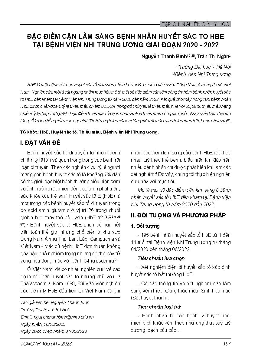 Đặc điểm cận lâm sàng bệnh nhân huyết sắc tố HBE tại Bệnh viện Nhi Trung ương giai đoạn 2020 - 2022