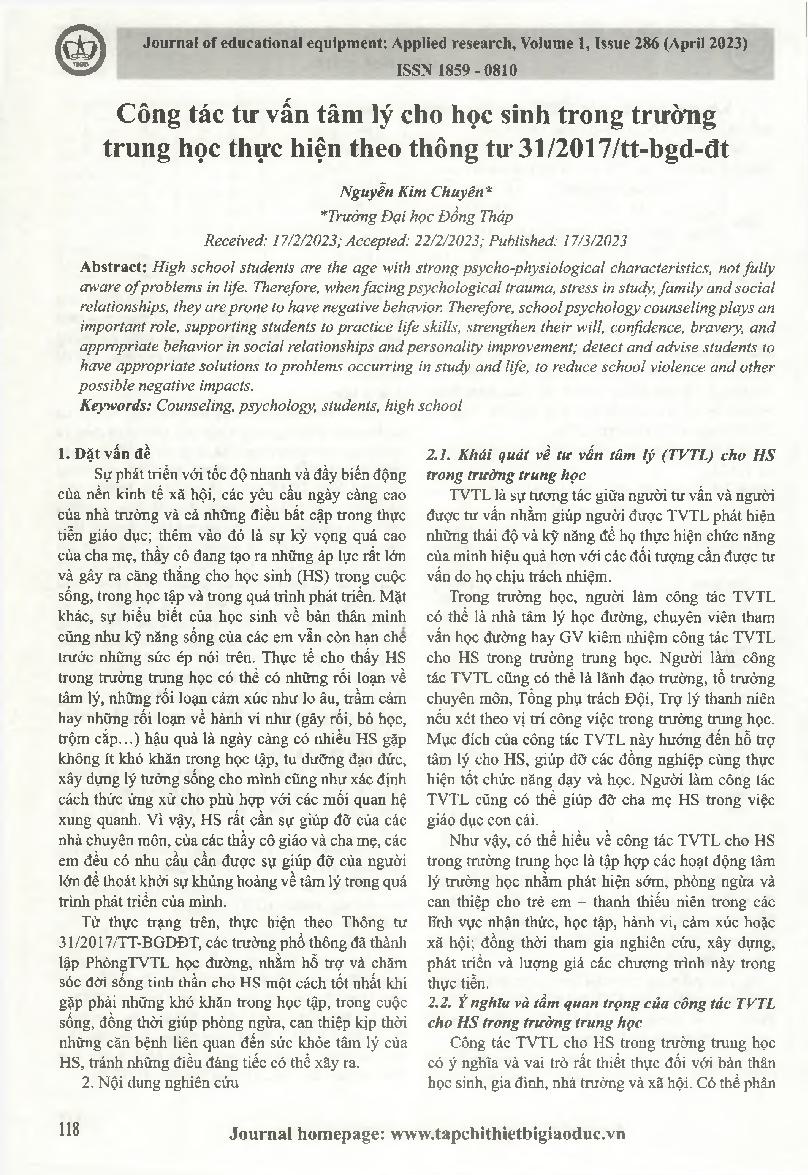 Công tác tư vấn tâm lý cho học sinh trong trường trung học thực hiện theo thông tư 31/2017/tt-bgd-đt = Psychological counseling for students in high schools in accordance with Circular 31/2017/tt-bgd-dt.