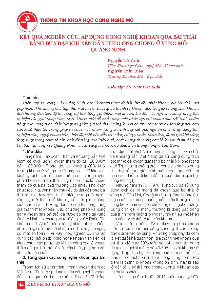 Kết quả nghiên cứu, áp dụng công nghệ khoan qua bãi thải bằng búa đập khí nén dẫn theo ống chống ở vùng mỏ Quảng Ninh