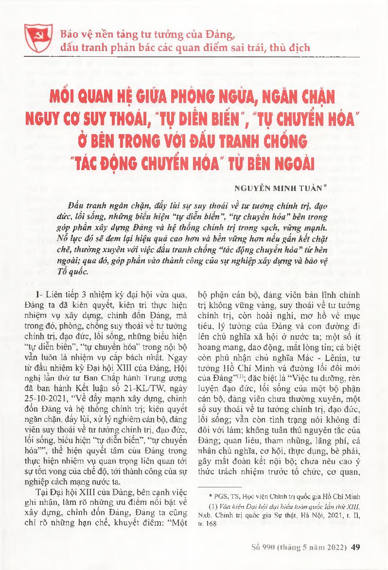 Mối quan hệ giữa phòng ngừa, ngăn chặn nguy cơ suy thoái, “tự diễn biến”, “tự chuyển hóa” ở bên trong với đấu tranh chống “tác động chuyển hóa” từ bên ngoài = The relationship between preventing and preventing the risk of recession, "self-evolution", "sel