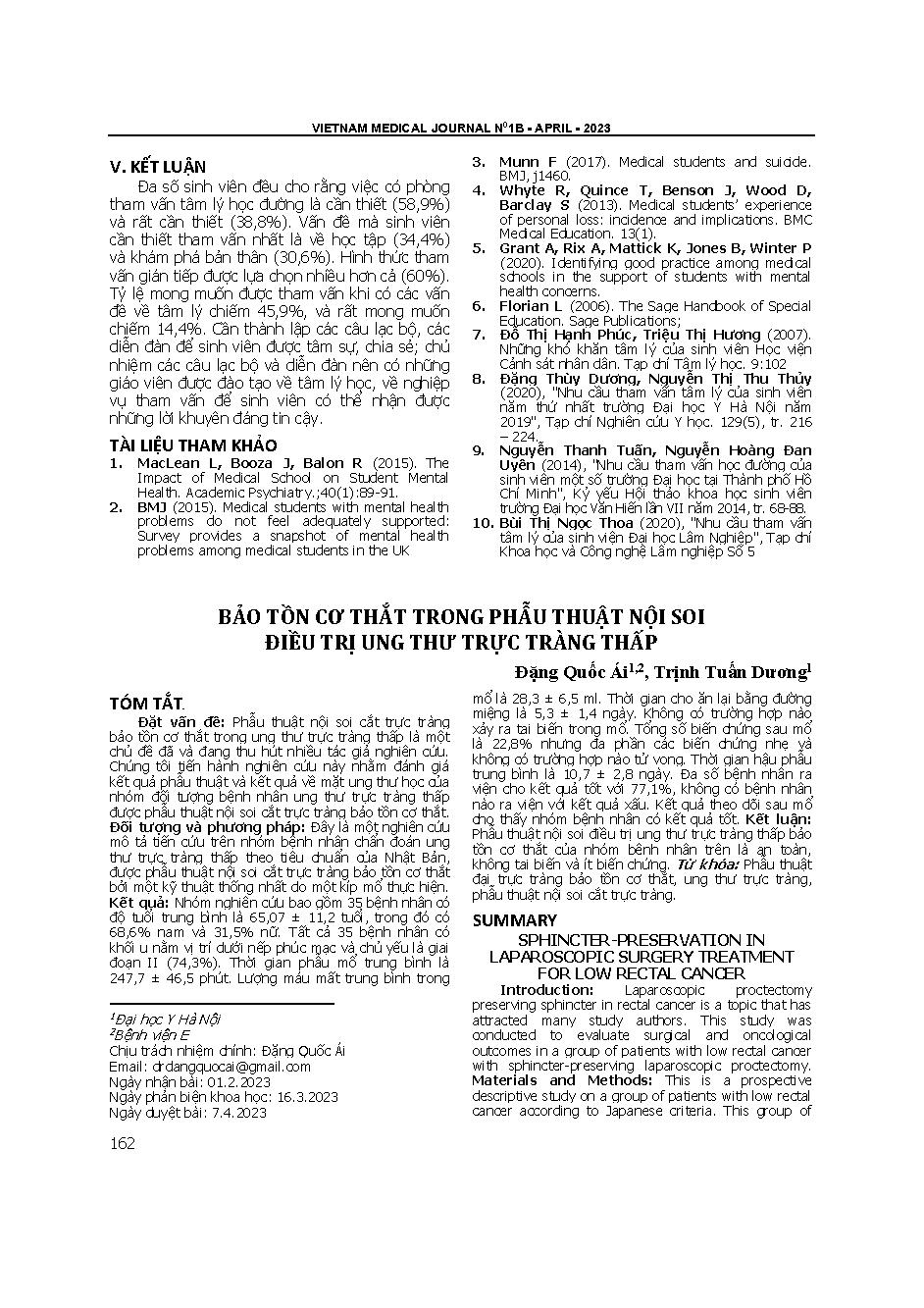 Bảo tồn cơ thắt trong phẫu thuật nội soi điều trị ung thư trực tràng thấp = Sphincter-preservation in laparoscopic surgery treatment for low rectal cancer