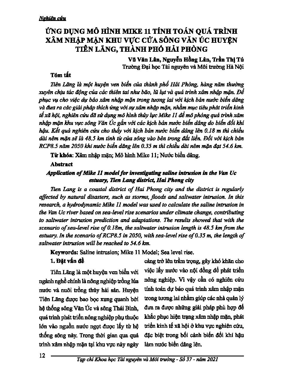 Ứng dụng mô hình Mike11 tính toán quá trình xâm nhập mặn khu vực cửa sông Văn Úc huyện Tiên Lãng, thành phố Hải Phòng = Application o f Mike 11 model for investigating saline intrusion in the Van Uc estuary, Tien Lang district, Hai Phong city