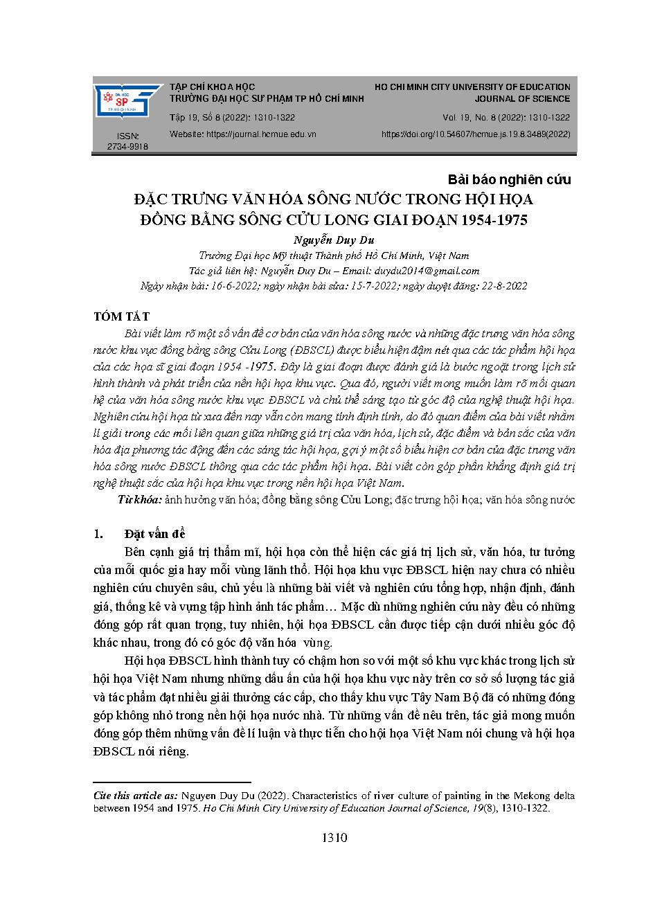 Đặc trưng văn hóa sông nước trong hội họa Đồng bằng Sông Cửu long giai đoạn 1954-1975 = Characteristics of river culture of painting in the mekong delta between 1954 and 1975