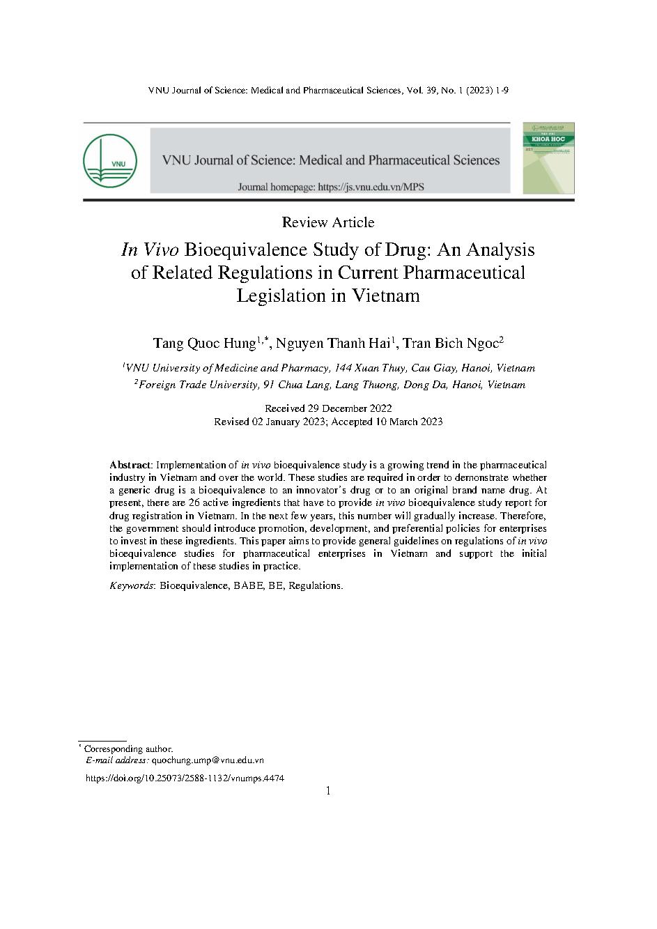 Phân tích các quy định liên quan đến nghiên cứu/thử tương đương sinh học của các thuốc trong các văn bản quy phạm pháp luật về dược hiện nay tại Việt Nam = In Vivo Bioequivalence Study of Drug: An Analysis of Related Regulations in Current Pharmaceutical