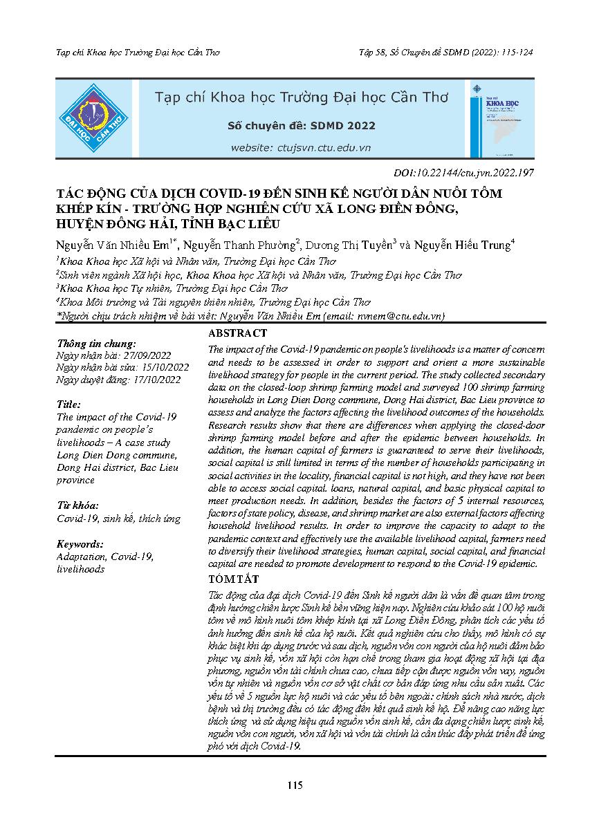 Tác động của dịch Covid-19 đến sinh kế người dân nuôi tôm khép kín - Trường hợp nghiên cứu xã Long Điền Đông, huyện Đông Hải, tỉnh Bạc Liêu = The impact of the Covid-19 pandemic on people’s livelihoods – A case study Long Dien Dong commune, Dong Hai distr