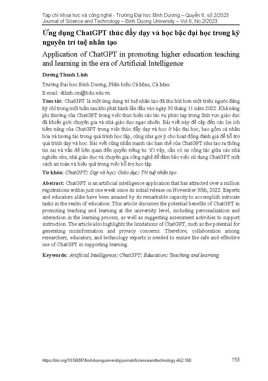 Ứng dụng ChatGPT thúc đẩy dạy và học bậc đại học trong kỷ nguyên trí tuệ nhân tạo = Application of ChatGPT in promoting higher education teaching and learning in the era of Artificial Intelligence