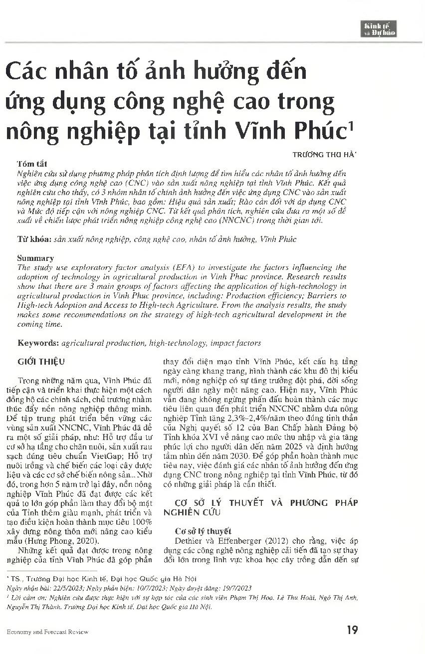 Các nhân tố ảnh hưởng đến ứng dụng công nghệ cao trong nông nghiệp tại tỉnh Vĩnh Phúc