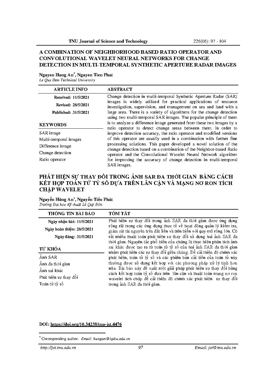 Phát hiện sự thay đổi trong ảnh sar đa thời gian bằng cách kết hợp toán tử tỷ số dựa trên lân cận và mạng nơ ron tích chập wavelet = A combination of neighborhood based ratio operator and convolutional wavelet neural networks for change detection in multi-temporal synthetic aperture radar images