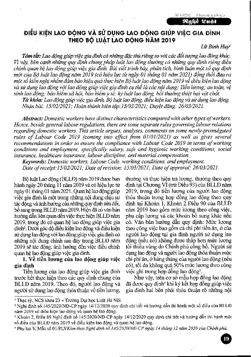 Điều kiện lao động và sử dụng lao động giúp việc gia đình theo Bộ luật lao động năm 2019 = Working conditions and using domestic workers under the Labor Code in 2019