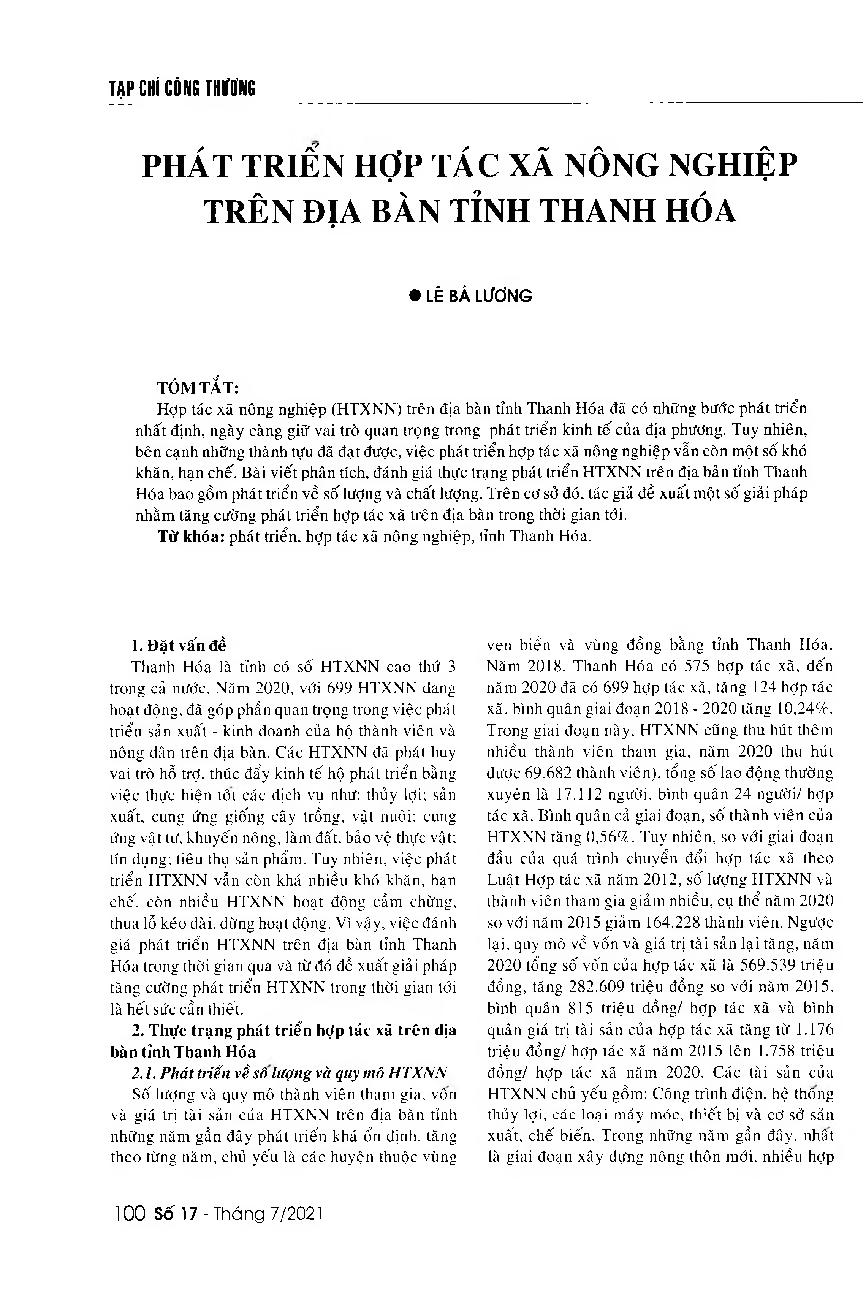 Phát triển hợp tác xã nông nghiệp trên địa bàn tỉnh Thanh Hóa = The development of agricultural cooperatives in Thanh Hoa Province