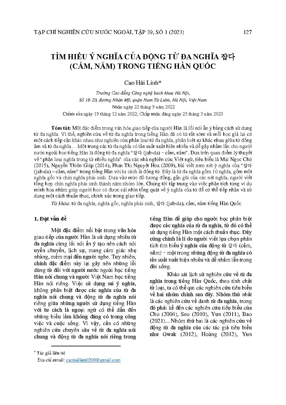 Tìm hiểu ý nghĩa của động từ đa nghĩa 잡다(cầm, nắm) trong tiếng Hàn Quốc = The meanings of the polysemous verb 잡다 (hold, grasp) in Korean
