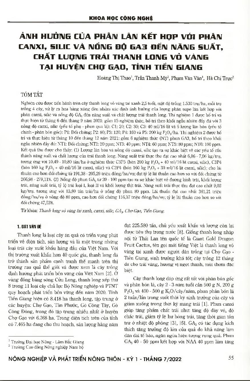 Ảnh hưởng của phân lân kết hợp với phân canxi, silic và nồng độ GA3 đến năng suất, chất lượng trái thanh long vỏ vàng tại huyện Chợ Gạo, tỉnh Tiền Giang = The effects of super phosphate combination with calcium silic fertilizer and GA3 concentration on yi