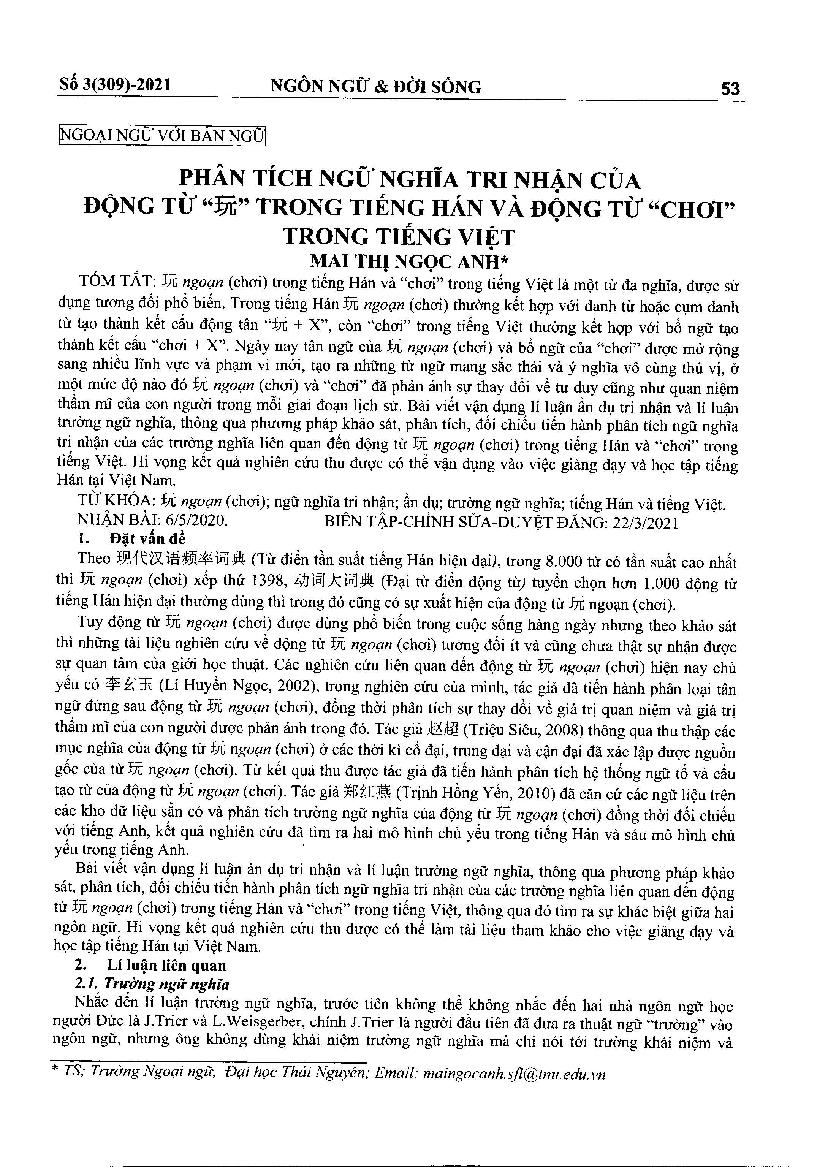 Phân tích ngữ nghĩa tri nhận của động từ “ngoạn (chơi)” trong tiếng Hán và động từ “chơi” trong tiếng Việt